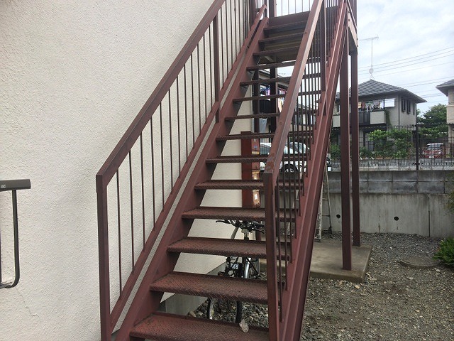 錆の発生、塗膜の密着不良が原因で不動産屋さんからのご依頼でした。 入念に密着不良箇所、錆の除去をして2液型の錆止めを塗布してウレタン樹脂仕上げでの施工になりました。
